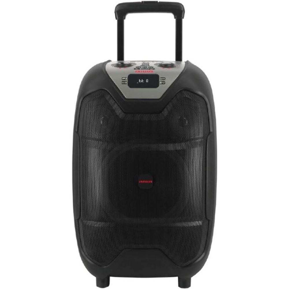 3.5 horas de reproducción // Bluetooth 5.2 // Sonido 10" + 2 x 3" // Alcance 10 metros // conexión múltiple 500 TWS // MP3 // Carga USB // Entrada 3.5 mm // Radio FM // Entrada micrófono // Indicador batería // Ruedas fácil transporte // Control remoto // Carga 6 horas //...