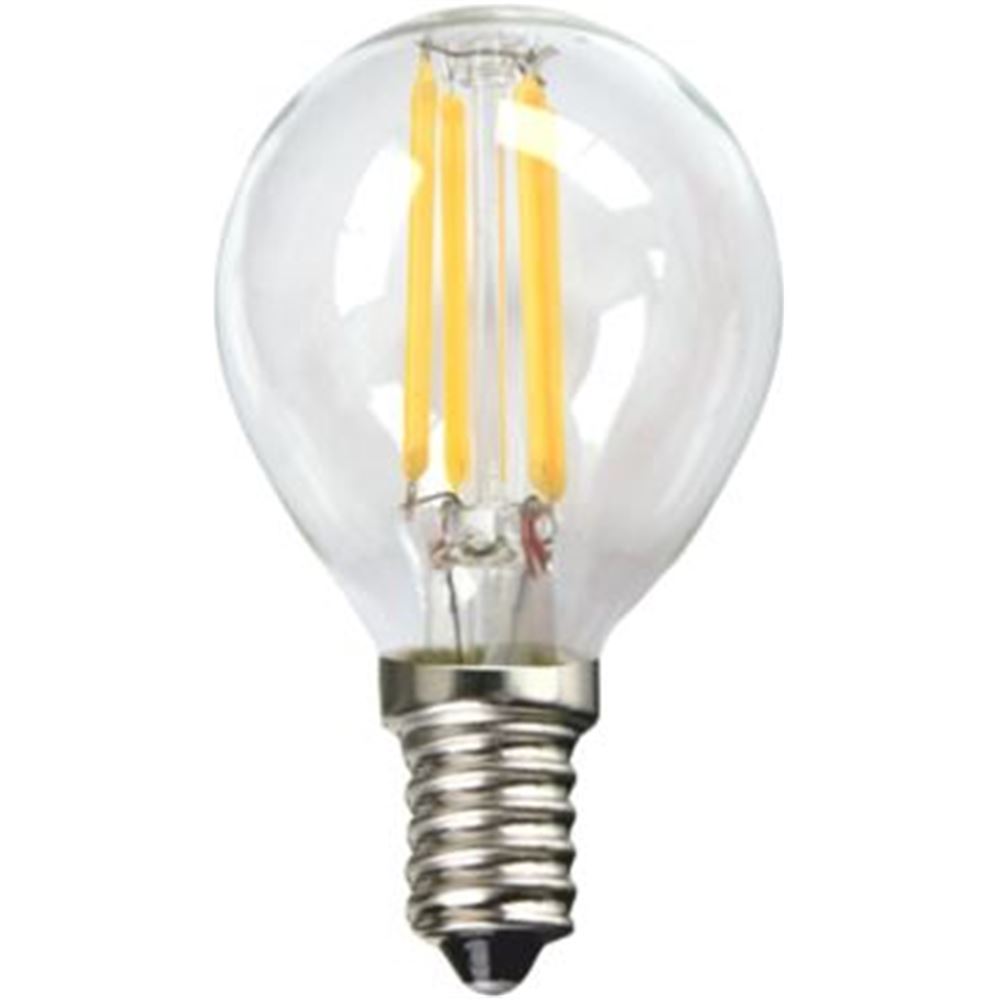 LED filamento esferica 4W E14 3000K // Potencia: 4W (Equivale a 60W // Base: E14 // Color: 3000 K Luz cálida // Duracion: 20.000 horas // Lumens: 450 // Voltaje: 230V // Ángulo: 320º // Altura: 76 mm // Diámetro: 45 mm...