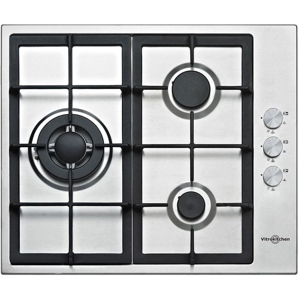 Encimera 3 quemadores a gas natural // Válvula de seguridad // Mandos laterales // Encendido electrónico // Parrillas de hierro colado // Incorpora inyectores para cambio de gas // Alt x An x Pr: 33 x 580 x 510 mm...