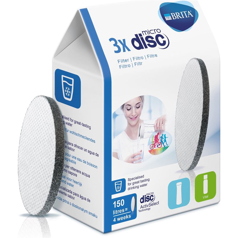 Un MicroDisc dura 4 semanas/150 l // El nuevo MicroDisc de BRITA, con tecnología ActivSelect, reduce de manera efectiva el cloro y otras sustancias que afectan al sabor // Un paquete contiene 3 MicroDiscos envasados individualmente....
