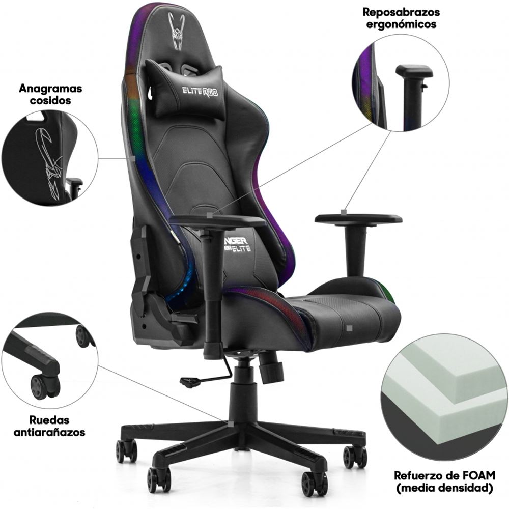 Respaldo inclinable: Si // Pistón de Gas: Clase 3 con altura ajustable // Ruedas antiarañazos: Si // Reposabrazos: Si, ajustable en 2D // Cojín: Lumbar y cervical de quita y pon // Luces Led: Si, con conexión USB a Power Bank (no incluida). RGB configurables // Material: Polipiel con textura carbono // Más información: Fácil de limpiar y materiales resistentes a la abrasión...