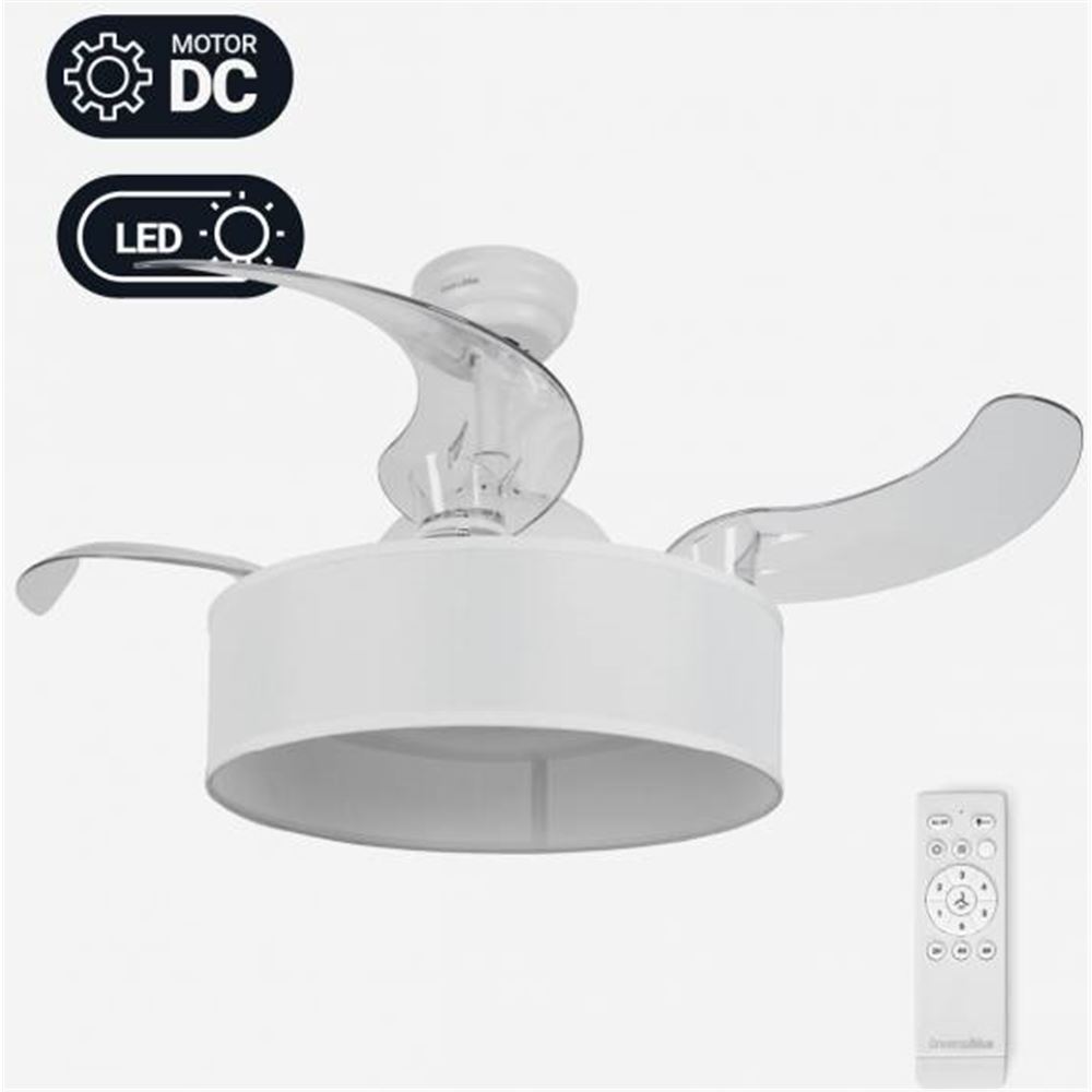65 W: De potencia.,2 in 1: Ventilador y Lámpara.,Easy Light: Luz led de 36 W.,3 Tipos de luz RGB: Cálida, fría o neutra.,Easy Silence: Equipado con Motor DC,Easy Timer: Temporizador. ,Easy Speed: 6 Velocidades.,Easy Control: Con mando a distancia.,Easy Surface: Ideal para superficies de entre 10 a 20 m.,Easy Accessories: Incluye accesorios para facilitar su instalación.,Soul Design: Tulipa de tela blanca y 4 aspas ocultables de plástico transparente....