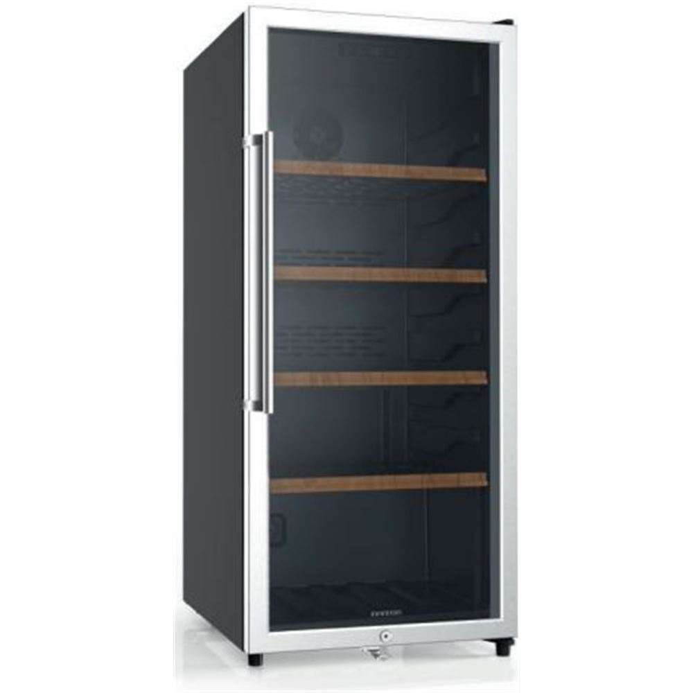 Clase energetica G // 118 botellas // Puerta de cristal templado // 4 Bandejas // Control de temperatura Electrónico // Tirador exterior inox // Cierre de seguridad on door con llave // medidas 124.4X54X60.1 //...